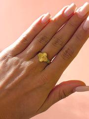 La bague Elyna – Petit Modèle séduit par son design délicat et raffiné. Plus discrète que sa version grand modèle, elle conserve le même motif lumineux inspiré d’une fleur solaire, finement travaillé pour capter la lumière à chaque mouvement. Élégante et intemporelle, elle habille la main avec subtilité et s’adapte aussi bien à un look casual qu’à une tenue habillée.