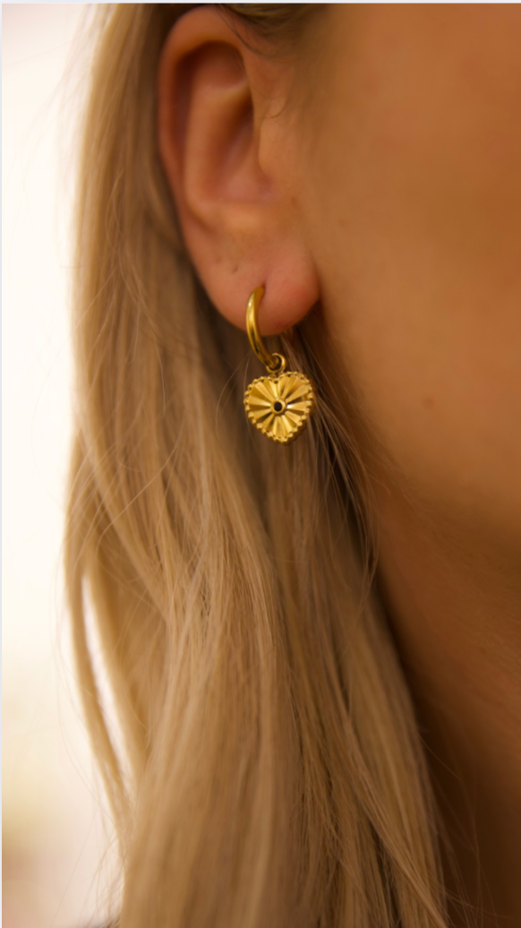 Les Boucles Lyora incarnent l’élégance romantique avec leur pendentif en forme de cœur doré finement texturé. Orné d’un détail central délicat, ce bijou capte la lumière à chaque mouvement et apporte une touche raffinée et lumineuse à vos tenues.