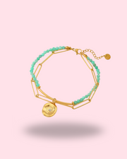 Un bracelet doré multi-rangs orné de perles vert d’eau et d’un médaillon martelé, chic et lumineux. Une pièce féminine et tendance, parfaite pour illuminer vos looks et accompagner toutes vos envies.
