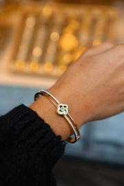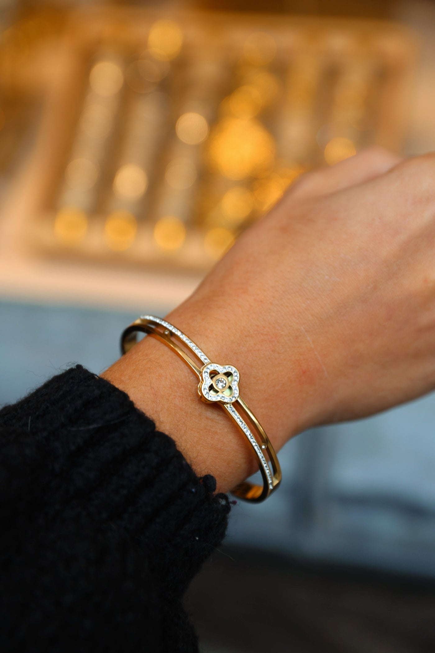 Le Jonc Avelia séduit par son raffinement et ses lignes épurées. Son motif trèfle ajouré, orné de strass étincelants, incarne l’élégance intemporelle et la féminité. Ce bijou bicolore joue sur le contraste entre l’or et l’argenté, pour un éclat sophistiqué qui illumine le poignet.