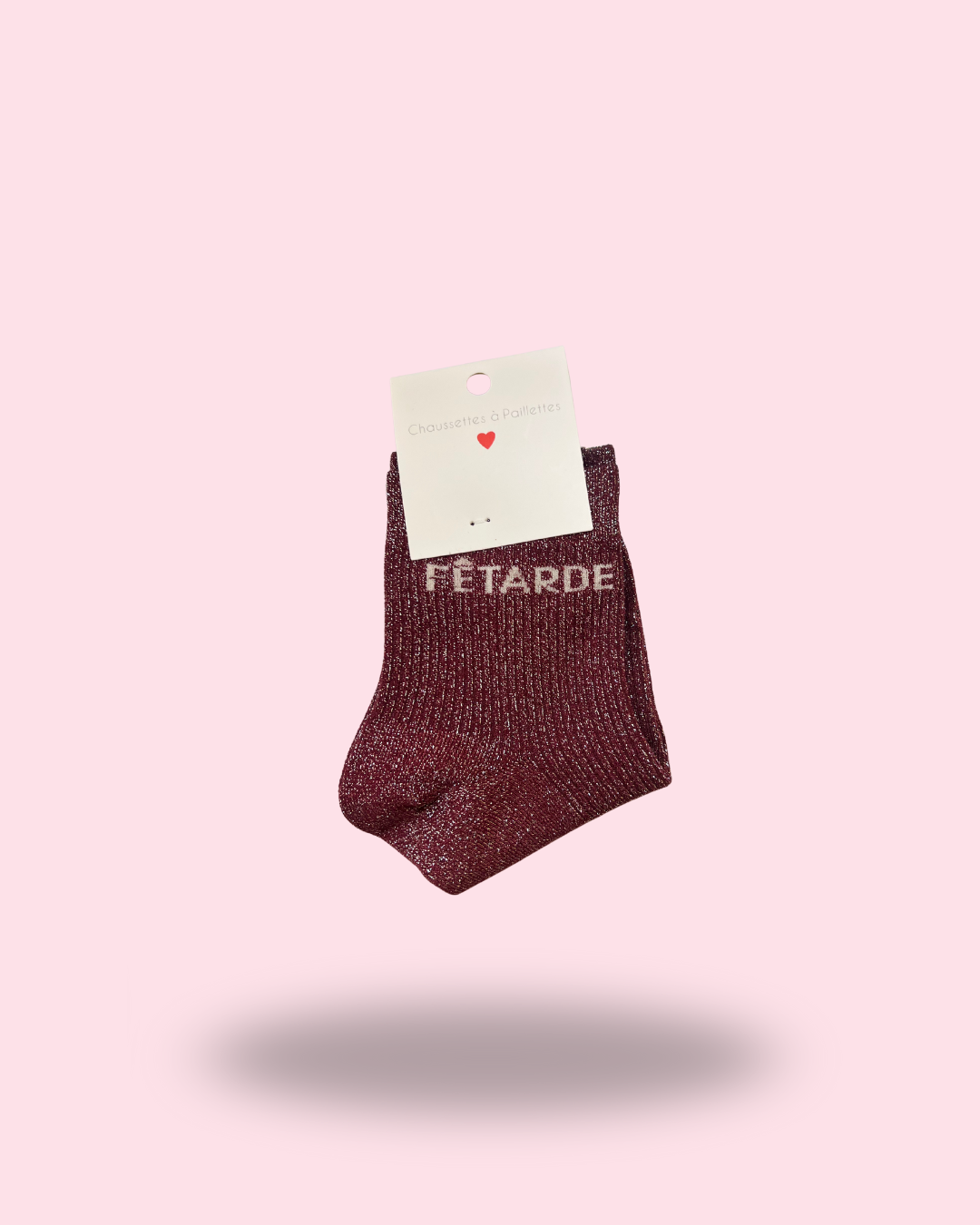 Les chaussettes pailletées bordeaux – Fêtarde sont l’accessoire idéal pour celles qui aiment briller… de jour comme de nuit. Leur teinte bordeaux scintillante attire instantanément le regard, tandis que l’inscription brillante FÊTARDE affirme une personnalité joyeuse, fun et pleine d’énergie.