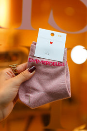 Les chaussettes Emmerdeuse rose pailleté sont l’accessoire parfait pour celles qui osent s’affirmer avec humour et légèreté. Brillantes, confortables et pleines de peps, elles deviendront vite tes préférées pour twister ton style au quotidien.
