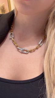 Le collier Gaspard est une pièce audacieuse qui combine modernité et élégance. Conçu en acier inoxydable et plaqué or, il séduit par son contraste raffiné entre maillons dorés allongés et maillons argentés sertis de strass scintillants. Ce mélange de textures et de finitions crée un bijou original qui attire la lumière et habille instantanément le décolleté.