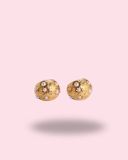 Les boucles d’oreilles Astréa dorées dévoilent un design texturé inspiré des éclats célestes, paré de délicates perles et de petites étoiles en relief.