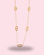Le sautoir Eléna met en lumière la maille marine dans une version longue et raffinée. Ses maillons emblématiques, répartis avec équilibre le long de la chaîne, créent un design structuré, moderne et lumineux.