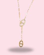 Le sautoir Marina met en valeur la silhouette avec son pendentif signature en maille marine, un motif emblématique revisité dans un esprit moderne et raffiné. Son anneau ovale pavé de zircons, associé à une chaîne dorée élégante, crée un équilibre parfait entre brillance et minimalisme.