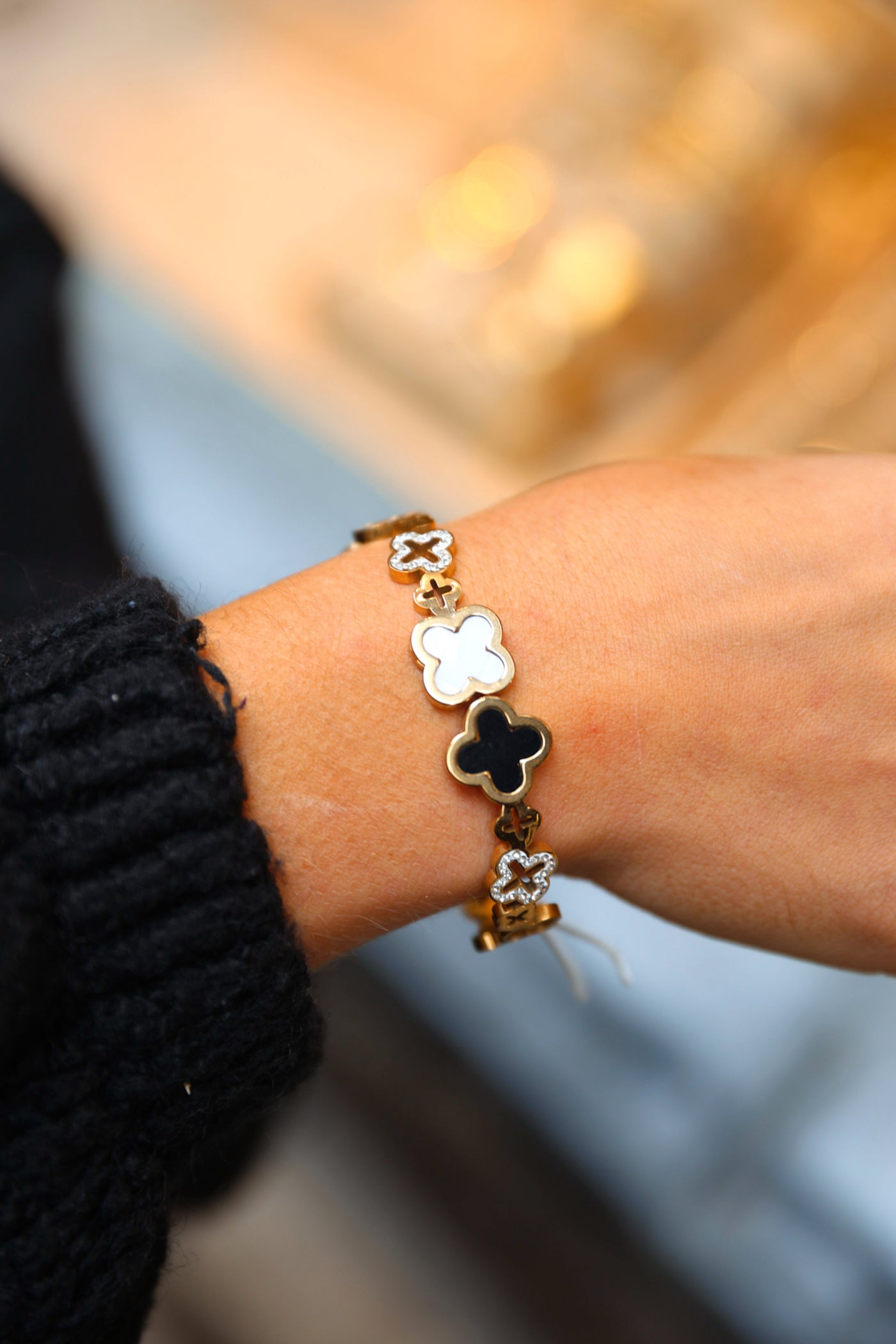 Le Bracelet Ornella séduit par son élégance intemporelle et ses contrastes raffinés. Ses pampilles en forme de trèfles, alternant entre noir profond, blanc lumineux et strass scintillants, en font un bijou unique qui capte la lumière et sublime chaque geste.