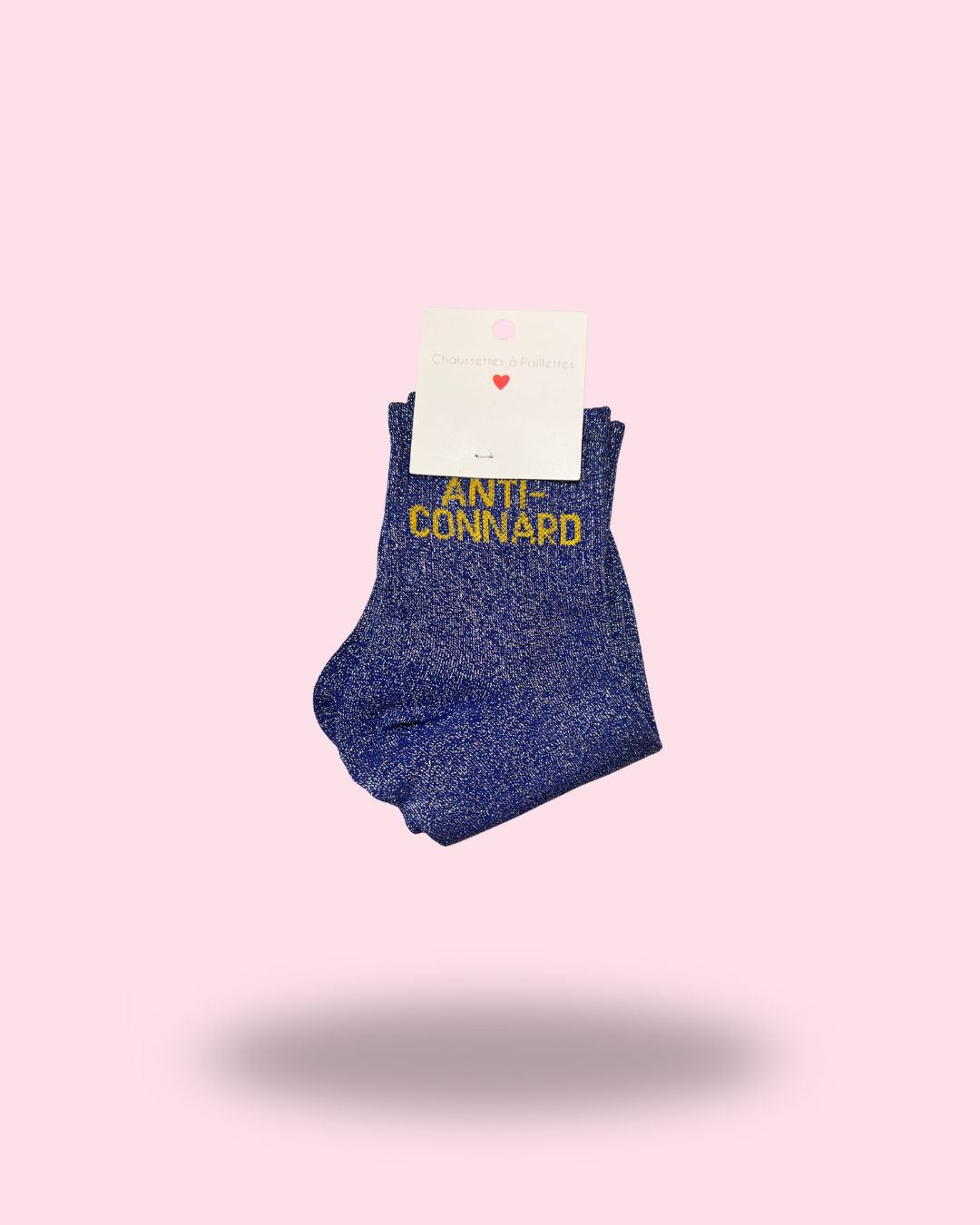 Les chaussettes pailletées bleues – Anti-Connard allient humour, éclat et caractère. Leur bleu profond réhaussé de fils scintillants attire instantanément le regard, tandis que l’inscription dorée ANTI CONNARD apporte une touche assumée, piquante et décalée.